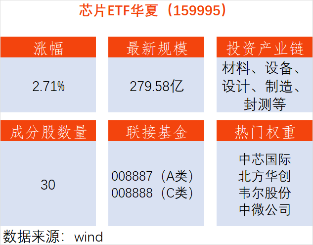 According to information, the Huaxia Chip ETF (159995) tracks the Guozheng Chip Index. It has 30 constituent stocks, gathering leading companies in China’s A-share chip industry across materials, equipment, design, manufacturing, packaging, and testing, including Semiconductor Manufacturing International Corporation, Cambricon, JCET, and Northern Hua Chuang, among others. Its off-exchange linked funds are: Class A: 008887; Class C: 008888.