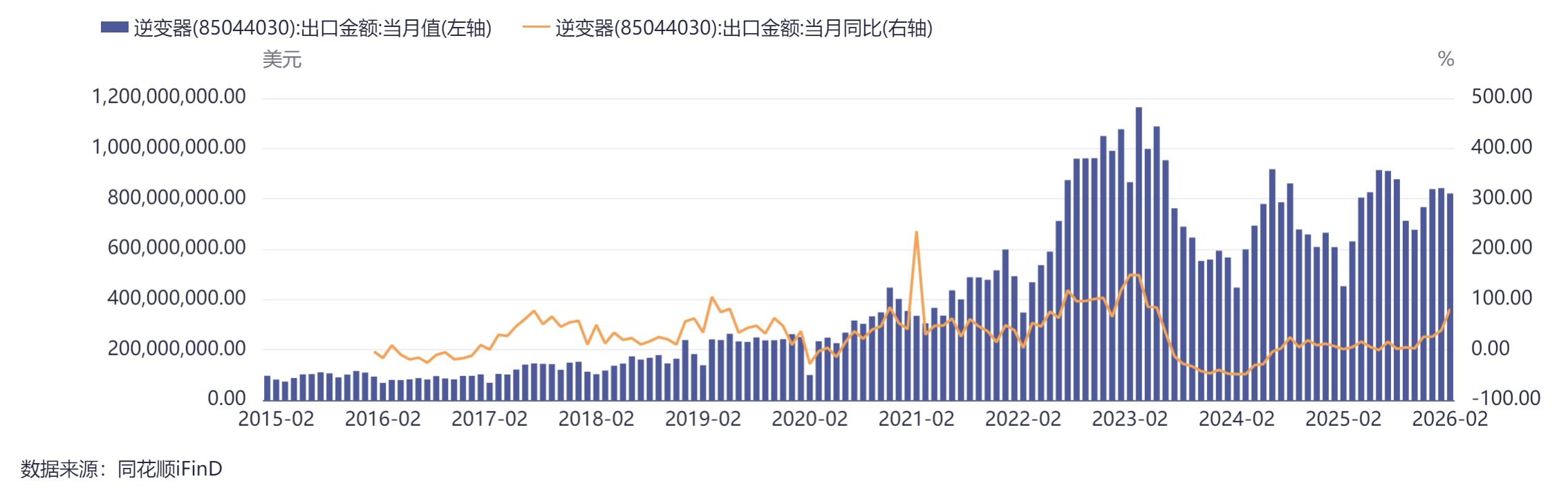 2026年1〜2月、わが国のインバーターの累計輸出額は116.11億元で、前年同期比52.14%増。アジア市場のパフォーマンスが特に際立ち、輸出は前年同期比・対前期比いずれも高い成長を示した。