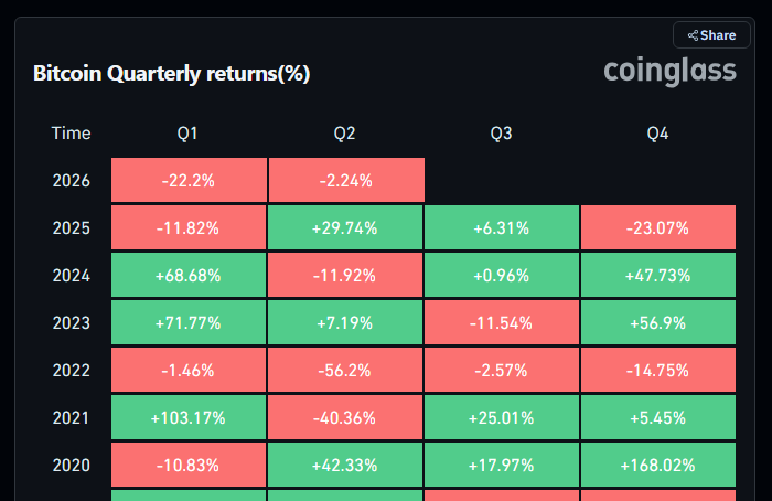 Coinglass data used in the report shows how unusual the quarter was when set against recent history. Bitcoin fell nearly 50% in the first quarter of 2018, then posted smaller swings in the years that followed.