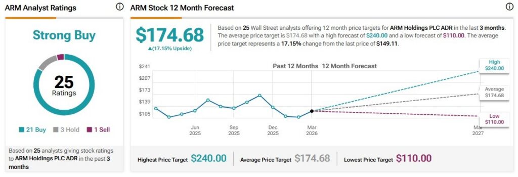 According to TipRanks, the average rating for ARM is Strong Buy, with 21 Buy, three Hold, and one Sell ratings. Based on 25 Wall Street analysts offering 12-month price targets for Arm Holdings, the average price target is $174.68, implying about 17.15% upside from the last price of $149.11.