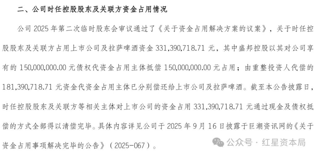 The company’s 2025 second extraordinary general meeting of shareholders approved the “Proposal on Solutions to Address the Misappropriation of Funds,” concerning the misappropriation of funds from the listed company and Lhasa Beer totaling RMB 331 million by the then controlling shareholder and related parties. Among them, Shengbang Holding used its creditor rights of RMB 150 million that it had against the company to offset the misappropriation of RMB 150 million by the fund misappropriation entity. Of the RMB 181 million in funds that would be repaid by the reorganization investors on behalf of the fund misappropriation entity, the amounts have been respectively repaid to the listed company and Lhasa Beer. As of the disclosure date of this announcement, all RMB 331 million in misappropriated funds owed by the then controlling shareholder and related parties, among other relevant entities, has been fully settled by means of cash and creditor-right offset arrangements.