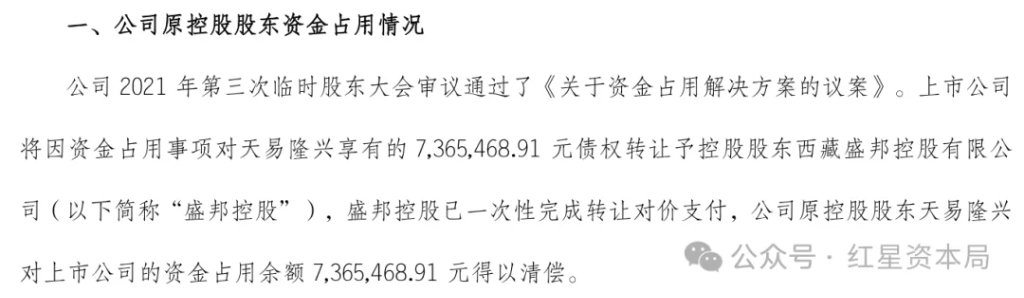 On March 25 this year, the company announced that at the company’s 2021 third extraordinary general meeting of shareholders, the proposal titled “Proposal on Solutions to Address the Misappropriation of Funds” was approved. The listed company will transfer approximately RMB 7.4 million in creditor rights that it has against Tianyilongxing due to the misappropriation issue to its controlling shareholder, Tibet Shengbang Holding Co., Ltd. (hereinafter referred to as “Shengbang Holding”). Shengbang Holding has completed payment of the transfer consideration in a single installment. As a result, the outstanding balance of approximately RMB 7.4 million of Tianyilongxing’s misappropriation of funds has been repaid to the listed company.