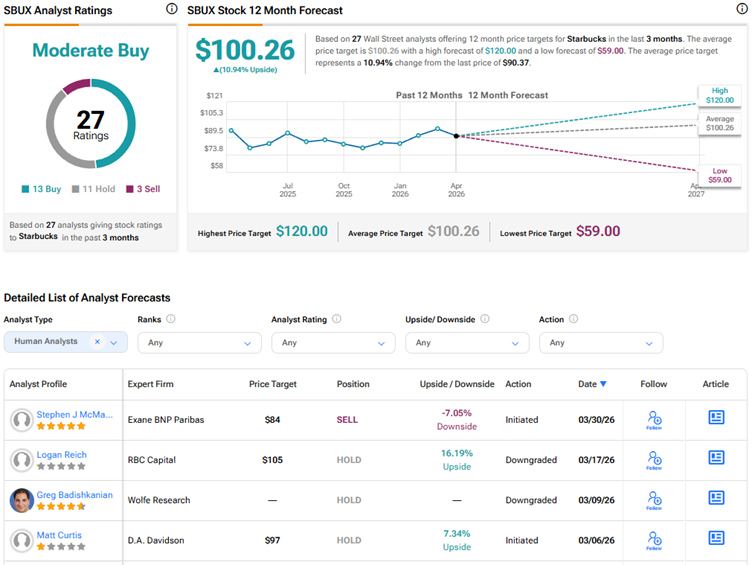 Given the ongoing challenges, Wall Street has a Moderate Buy consensus rating on Starbucks stock, based on 13 Buys, 11 Holds, and 3 Sells. The average SBUX stock price target of $100.26 indicates about 11% upside potential. SBUX stock has risen 7% year-to-date.