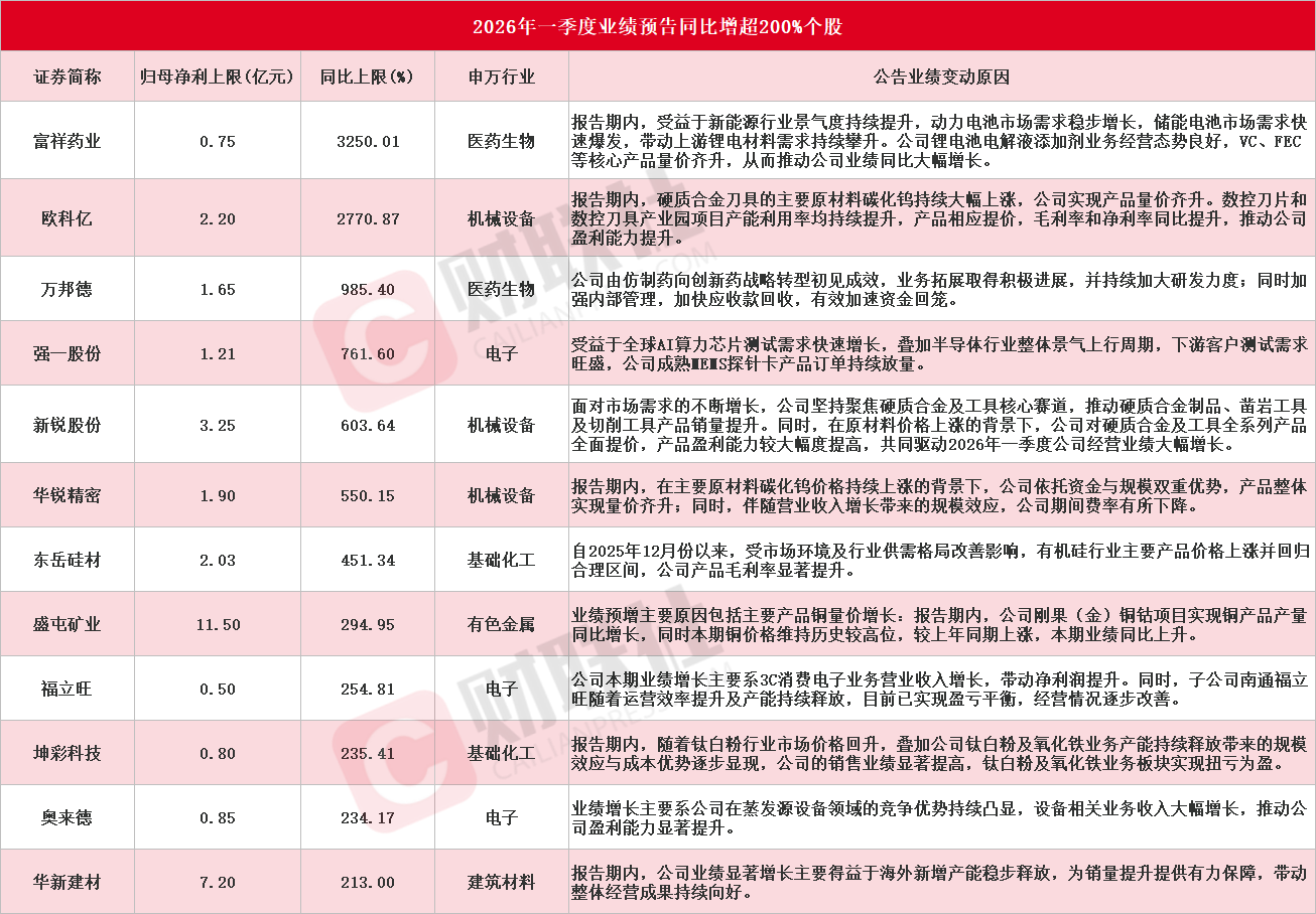 According to incomplete statistics by China Financial Information and Services Co., Ltd. (Cailian Society), as of the time of this release, a total of 36 A-share listed companies have issued first-quarter 2026 earnings guidance. Among them, 12 individual stocks have net profit year-on-year growth with the upper limit exceeding 200%—namely, Fuxiang Pharmaceutical, OKEYI, Wanbangde, Qiangyi Shares, Xinrui Shares, Huarui Precision, Dongyue Silicon Materials, Shengtun Mining, Fuliwang, Kuncai Technology, Ollaud, and Huaxin Building Materials (for specific details, see the chart below). In addition, Demingli, BoHui Co., Ltd., Weierli, and others are expected to turn a loss into a profit in the first quarter.