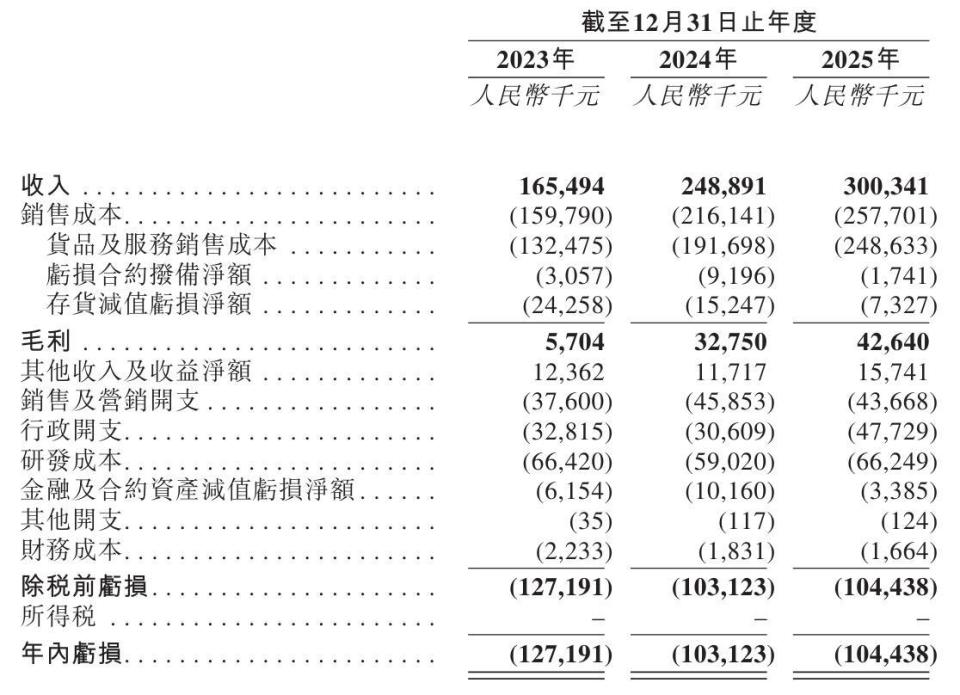 The prospectus shows that Corely’s revenues in 2023, 2024, and 2025 were 165 million, 249 million yuan, and 300 million yuan, respectively; gross margins were 5.7 million, 32.75 million yuan, and 42.64 million yuan, respectively; and losses during the period were 127 million, 103 million yuan, and 104 million yuan, respectively.