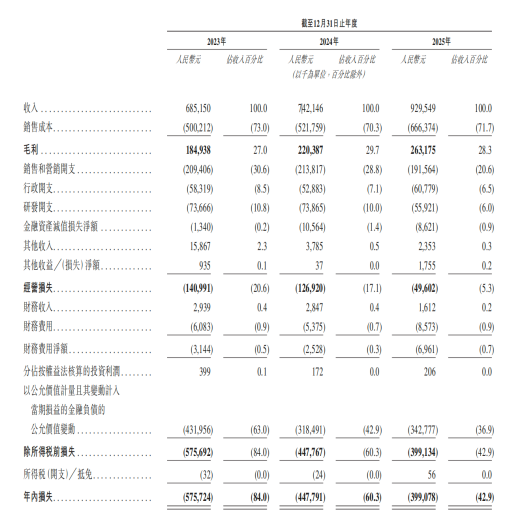 The prospectus shows that in 2023, 2024, and 2025, Kaisi’s revenue was RMB 685 million, RMB 742 million, and RMB 930 million, respectively; gross profit was RMB 185 million, RMB 220 million, and RMB 263 million, respectively; gross margin was 27%, 29.7%, and 28.3%, respectively; losses were RMB 576 million, RMB 448 million, and RMB 399 million, respectively.