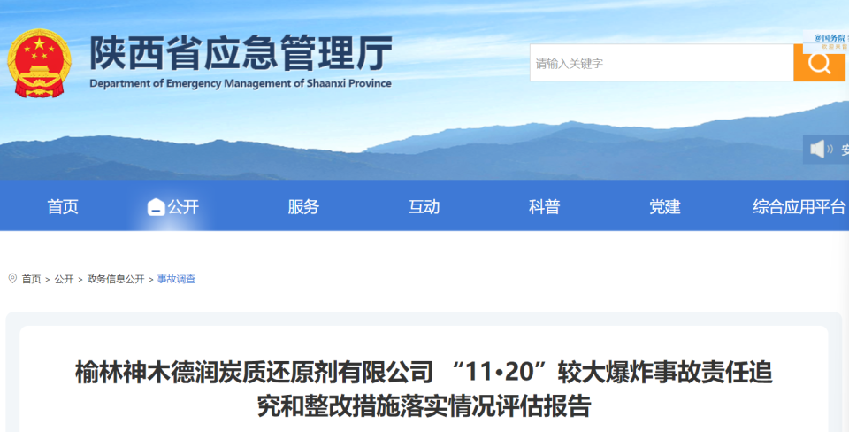 On April 3, the Shaanxi Provincial Department of Emergency Management released the “Yulin Shenmu Derun Carbonaceous Reduction Agent Co., Ltd. ‘11·20’ larger explosion incident accountability investigation and rectification measures implementation assessment report.”