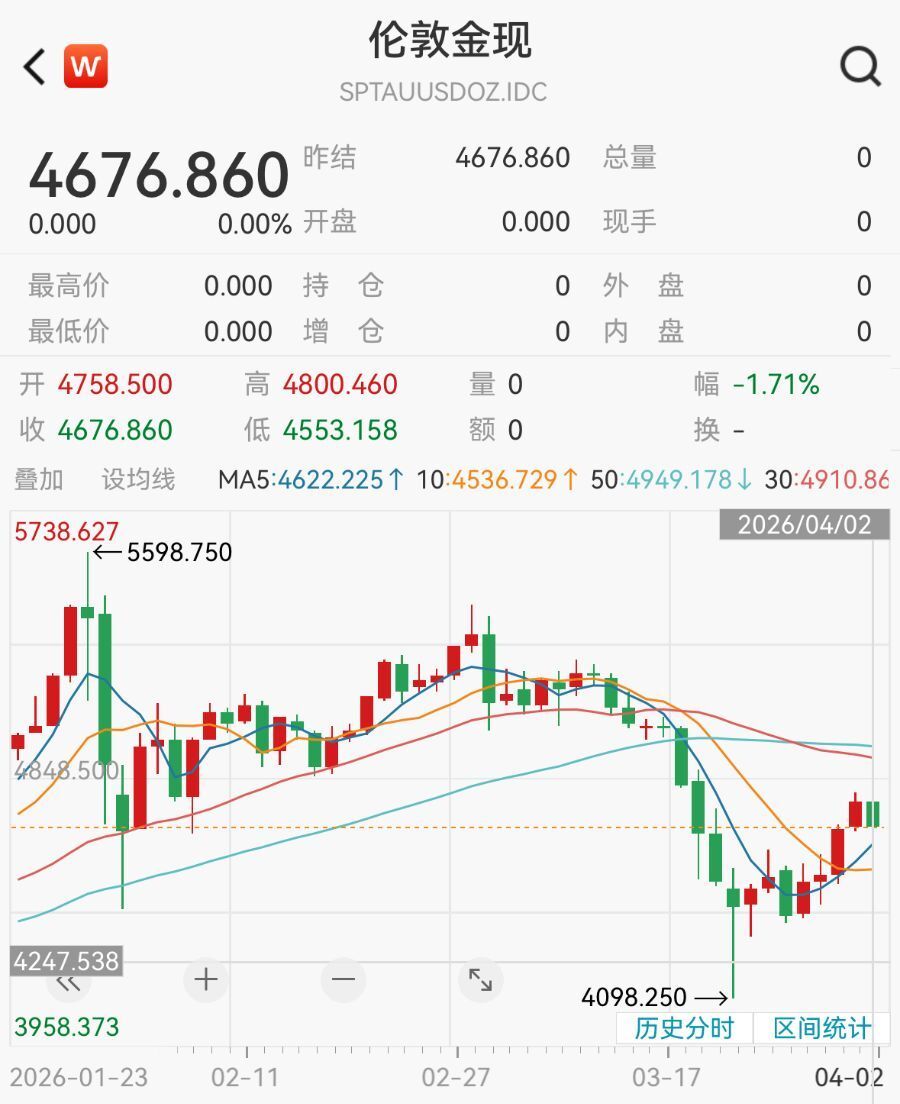 At midnight Beijing time on April 3, gold prices paused their four-day rally, with spot gold closing down 1.71% at $4,676.86 per ounce; COMEX gold futures fell 2.29%, remaining above $4,700.