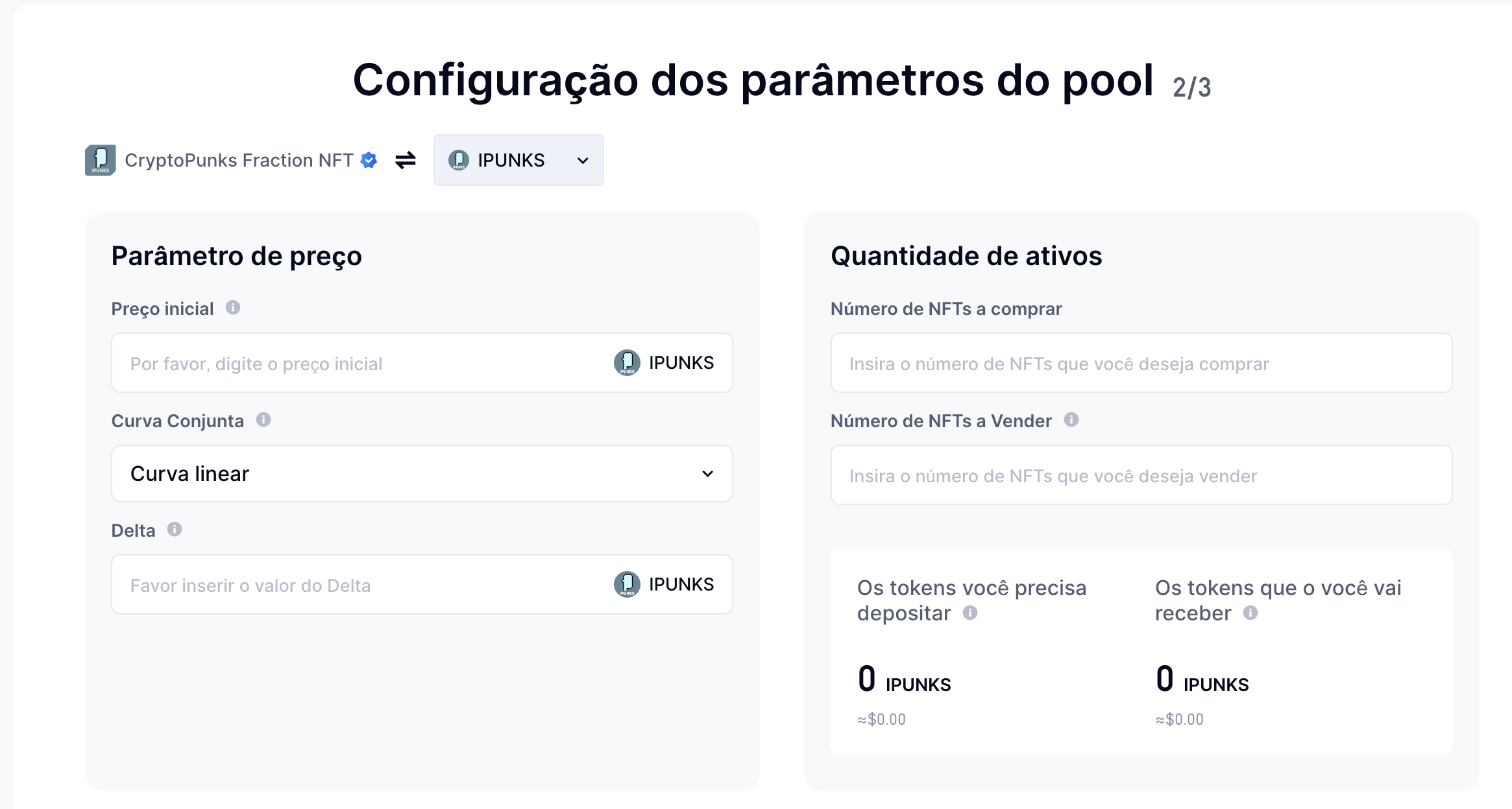 A seguir, defina os parâmetros do pool de liquidez: