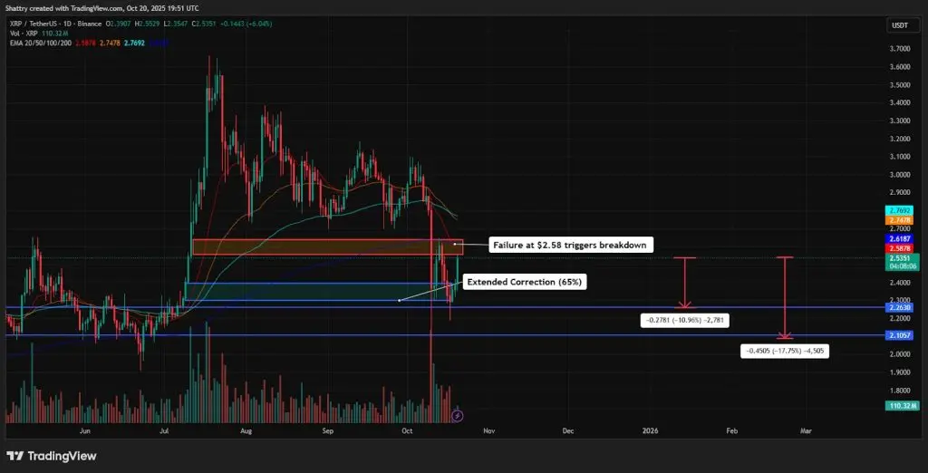 Cair abaixo de 2,58 dólares irá desencadear uma queda para 2,10 dólares a 2,25 dólares (espaço de queda de 10% a 15%). O despejo de 120 milhões de dólares de Larsen e o volume de transações fraco indicam uma nova queda. Este é o cenário com a maior probabilidade na previsão de preços do ChatGPT para XRP, refletindo a atual estrutura técnica amplamente baixista. Se esse cenário se concretizar, será feita uma nova testagem da área de mínimos de fevereiro a março.