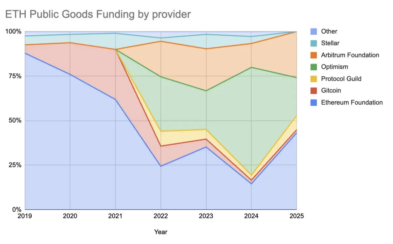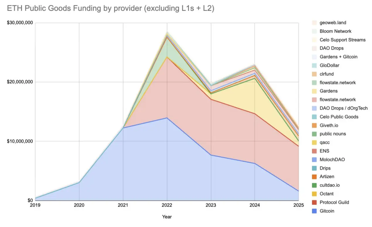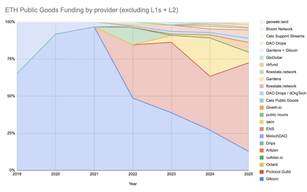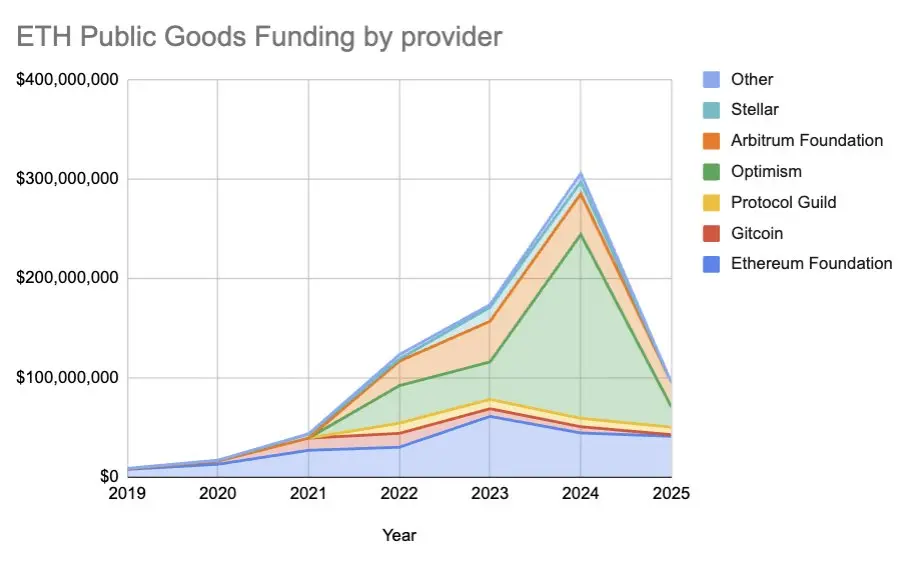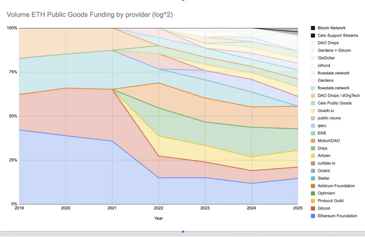 Atualmente, a esmagadora maioria do financiamento de bens públicos no Ethereum provém de programas tradicionais de subsídios de L1 e L2, como: Ethereum Foundation, Stellar, Optimism, Arbitrum, etc.