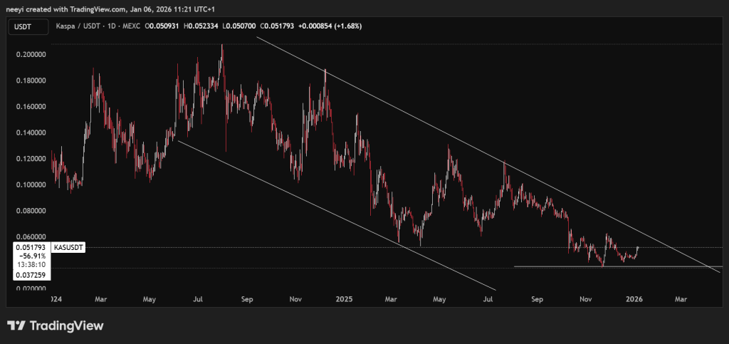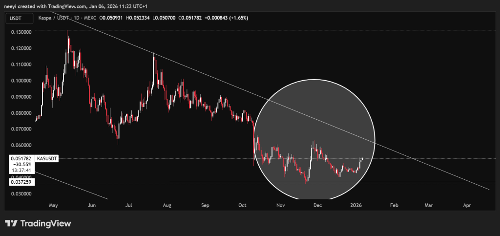 A estrutura técnica continua sendo a maior restrição ao preço do Kaspa. Desde o pico de meados de 2024, o KAS tem negociado dentro de um canal decrescente claro. Máximos mais baixos e recuperações controladas definiram a maior parte de 2025, reforçando uma fase corretiva mais ampla do que uma reversão de tendência.