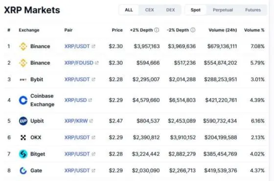De acordo com os dados do CoinMarketCap, o XRP tem menor liquidez do que o Ethereum ou Solana nas principais bolsas. A liquidez do livro de ordens de ±2% nas 10 principais bolsas à vista é de apenas $51 milhões.