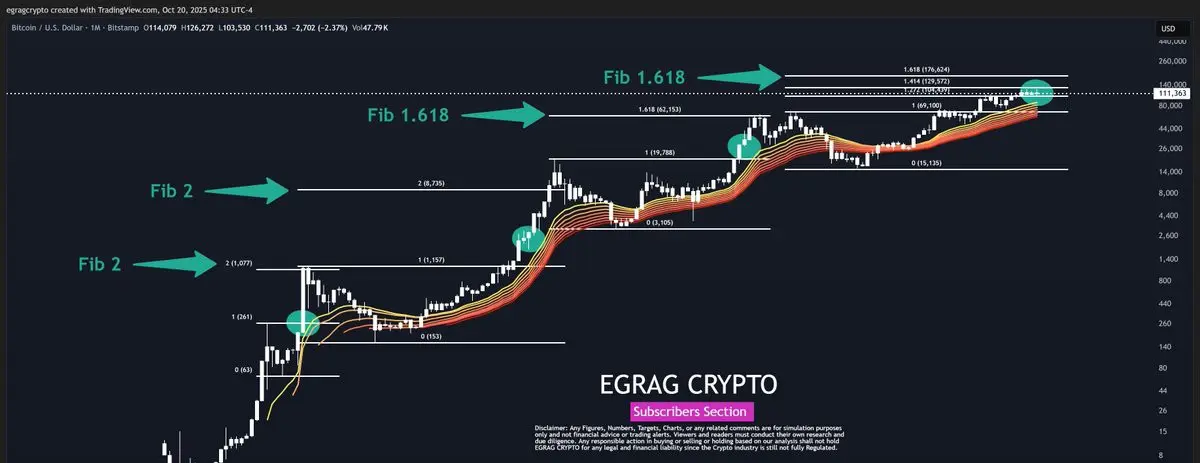 O gráfico de EGRAG identifica movimentos repetidos de Fib 2 → Fib 1.618 ao longo de múltiplos ciclos do Bitcoin, cada um marcando uma poderosa etapa final antes de correções acentuadas. “Os padrões sempre se repetem, apenas disfarçados por flutuações menores,” observou o analista, acrescentando que a estrutura atual espelha os estágios anteriores de pré-euforia vistos antes dos picos dos ciclos passados.