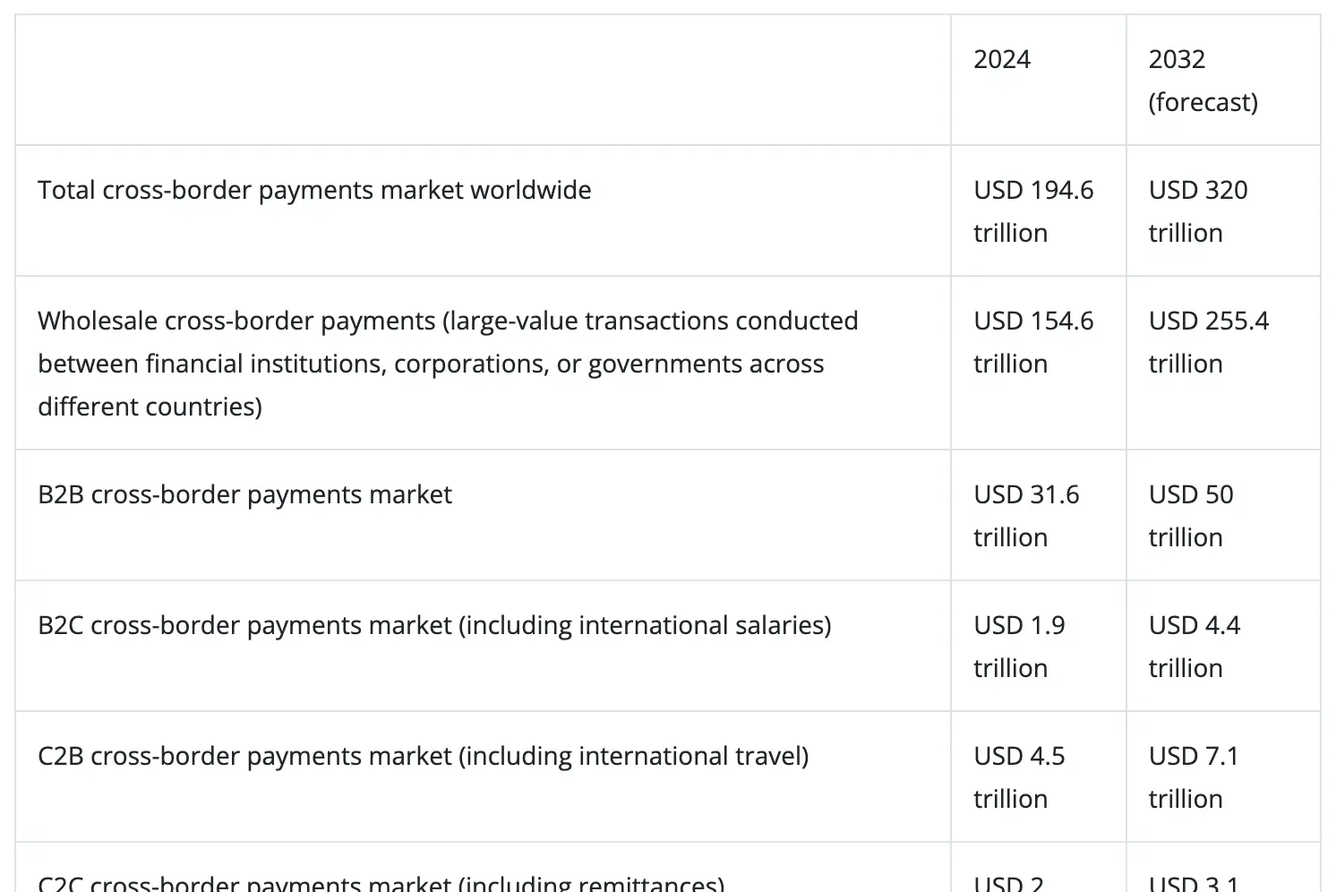 Pagamento transfronteiriço abrange todos os fluxos de transações de um país para outro, tanto para necessidades empresariais, de consumidores, como para remessas de trabalhadores migrantes. De acordo com dados da Statista, o valor total das transações globais deve atingir US$194,6 trilhões em 2024 e pode disparar até US$320 trilhões em 2032. Com uma escala econômica tão grande, qualquer aumento de eficiência, por menor que seja, terá um grande impacto tanto para os empresários quanto para os consumidores.