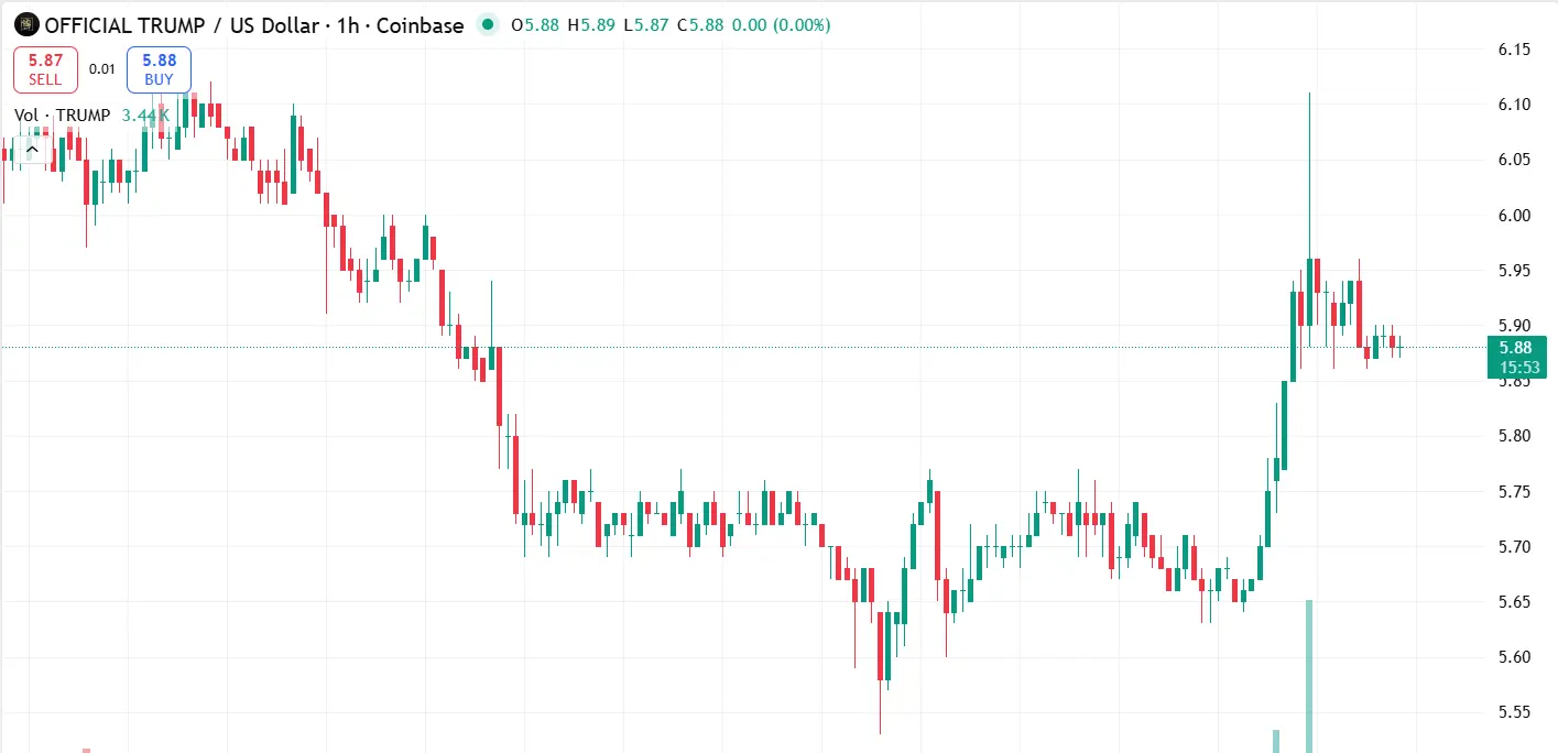 O token TRUMP atualmente é negociado a $5.88, refletindo um aumento de 5% nas últimas 24 horas. No entanto, permanece 92% abaixo do seu máximo histórico de $75.35 registrado em janeiro de 2025. No gráfico técnico, o TRUMP está testando a resistência próxima ao nível de $5.80.