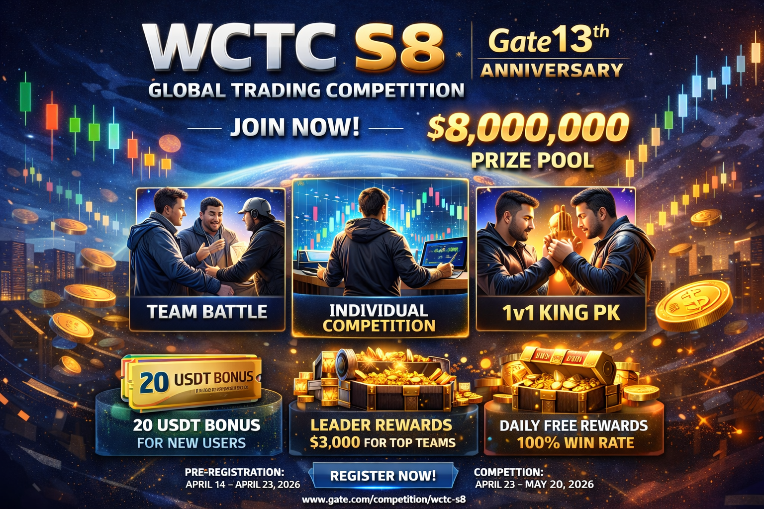 A altamente aguardada Competição Global de Negociação WCTC S8 abriu oficialmente as inscrições, marcando um destaque importante nas celebrações do 13º aniversário da Gate. Com um enorme $8 milhão de prêmio, este evento global convida traders de todos os níveis a competir, colaborar e mostrar suas estratégias em um palco internacional.