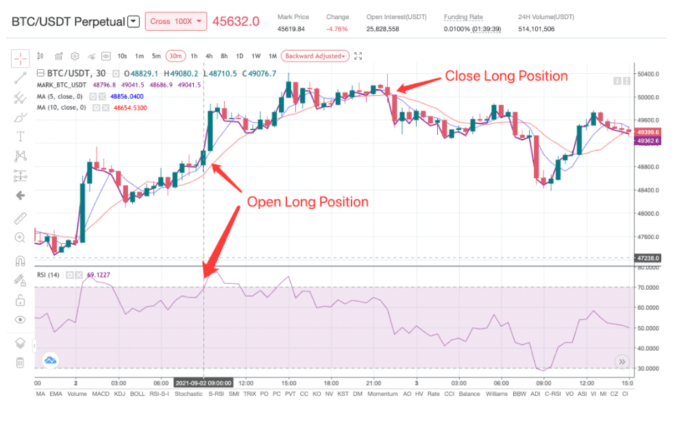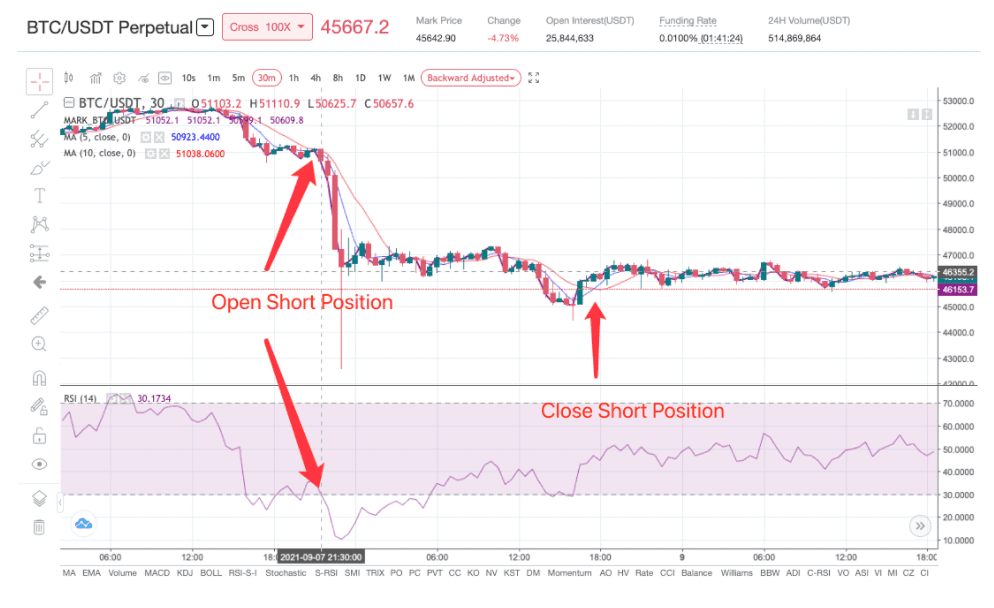 Quando a média móvel de curto prazo cruza abaixo da média móvel de longo prazo e o valor do Índice de Força Relativa (RSI) é de 50-(limiar) ou inferior, o bot irá ficar short. Quando a média móvel de curto prazo ultrapassa a média móvel de longo prazo e o valor RSI é 50+ limiar ou superior, o bot fechará a posição long. Por exemplo, no gráfico abaixo, o limiar está definido para 15 e os pontos de entrada e saída são indicados por setas: