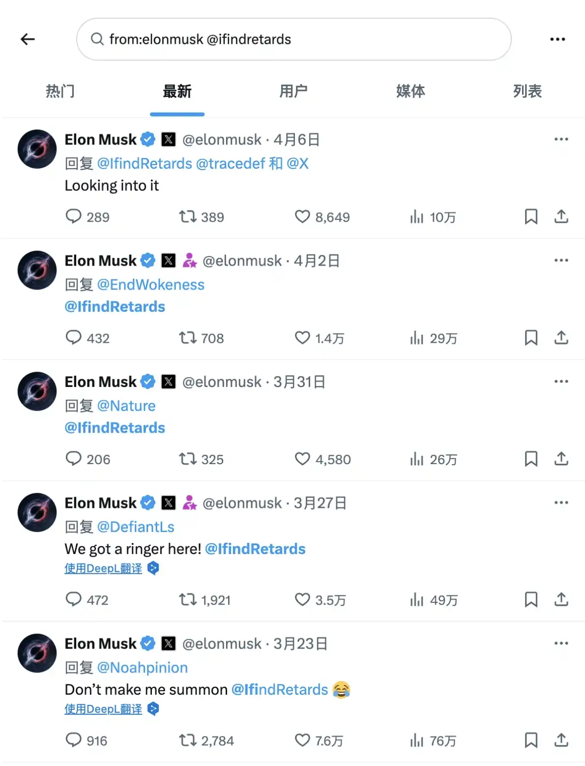 Ao pesquisar na página do Musk “from:elonmusk @ifindretards”, não é difícil perceber que a interação entre estas duas contas é anormalmente frequente. Nos últimos 35 dias, houve um total de 22 interações entre as partes, das quais 11 foram Musk @ mencionando a outra parte, muito superior à sua média mensal de interações de 3-5 com a conta oficial da Tesla (@Tesla).