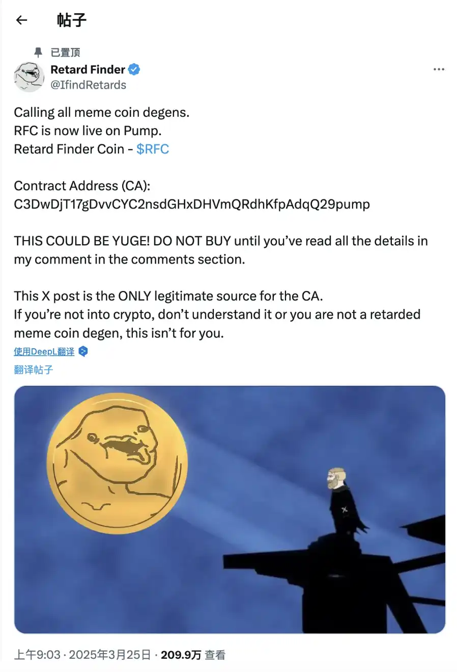 Em 7 de março, quando todo o mercado cripto estava imerso no triste mercado de um crash, um projeto de meme conceitual de Musk chamado “RFC” (Retard Finder Coin) contrariou a tendência. De acordo com dados da GMGN, o preço da RFG subiu mais de 200% nas últimas 48 horas, com um valor de mercado de quase US$ 30 milhões em seu valor mais alto.