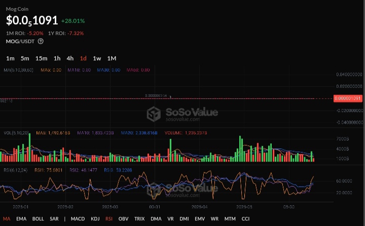 Mog Coin (MOG) tem trilhado um caminho notável no mercado de moedas meme com a recente alta repentina nos preços, subindo 133% no último mês e ganhando 27% nas últimas 24 horas.