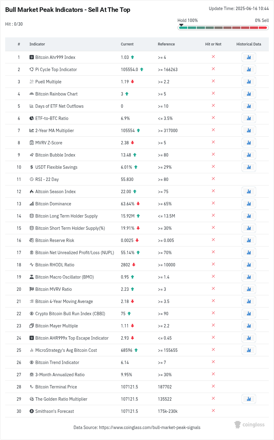 De acordo com a CoinGlass, uma empresa de análise de mercado, 30 indicadores estão atualmente pedindo aos investidores para “manter 100% de alocação” em seus investimentos, sugerindo que o Bitcoin ainda tem um forte potencial de crescimento antes de atingir um pico de longo prazo.