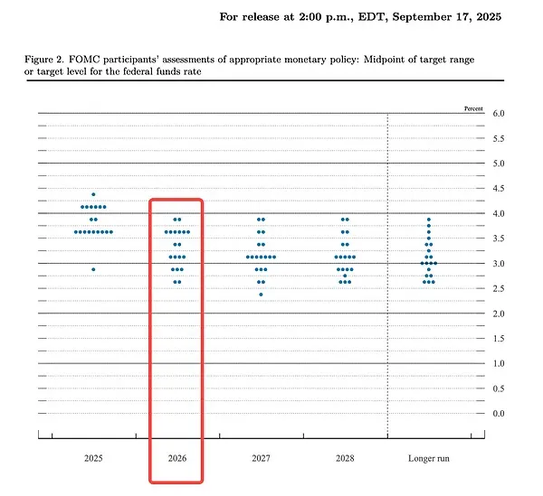 A taxa atual é 3,75%-4,00%. Se no final de 2025 descer para cerca de 3,4%, serão só 1-2 cortes ao longo do ano. Mas no gráfico, há membros a apontar para 2,5% (4-5 cortes) e outros para 4,0% (nenhum corte).