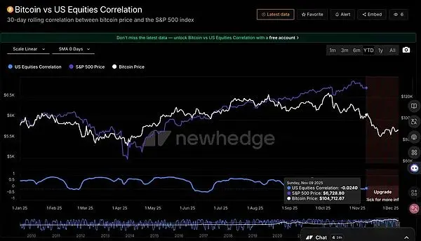Segundo a CME, desde 2020 a correlação do BTC com o Nasdaq 100 passou de quase zero para cerca de 0,4, chegando a ultrapassar 0,7. A The Kobeissi Letter destacou recentemente que a correlação a 30 dias chegou a 0,8, o máximo desde 2022.