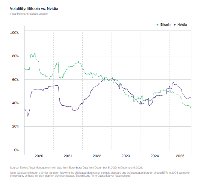 A Bitwise refere que, embora o Bitcoin seja frequentemente criticado pela sua elevada volatilidade, em 2025 a sua volatilidade foi na realidade inferior à das ações populares do mercado, como a Nvidia.