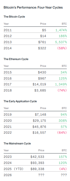 A análise da Bitwise indica que, historicamente, o Bitcoin segue um ciclo de quatro anos de alta de três anos e recuo de um ano. Segundo essa regra, 2026 deveria ser um ano de recuo, mas a equipa acredita que desta vez será diferente.