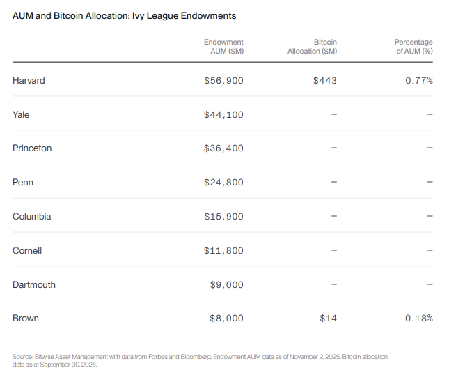Após Harvard e Brown, a Bitwise espera que mais universidades da Ivy League sigam o exemplo e invistam em criptomoedas.