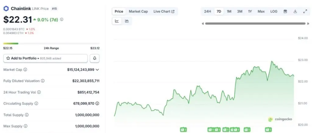 Esta queda nas reservas sugere uma acumulação contínua, à medida que os investidores transferiram os seus tokens para armazenamento a frio em meio a uma crescente demanda. Durante este período, o preço do LINK saltou de $7 para mais de 22 $. Alguns analistas até previram um aumento de preço em direção a 100 $, indicando o potencial para um novo recorde.