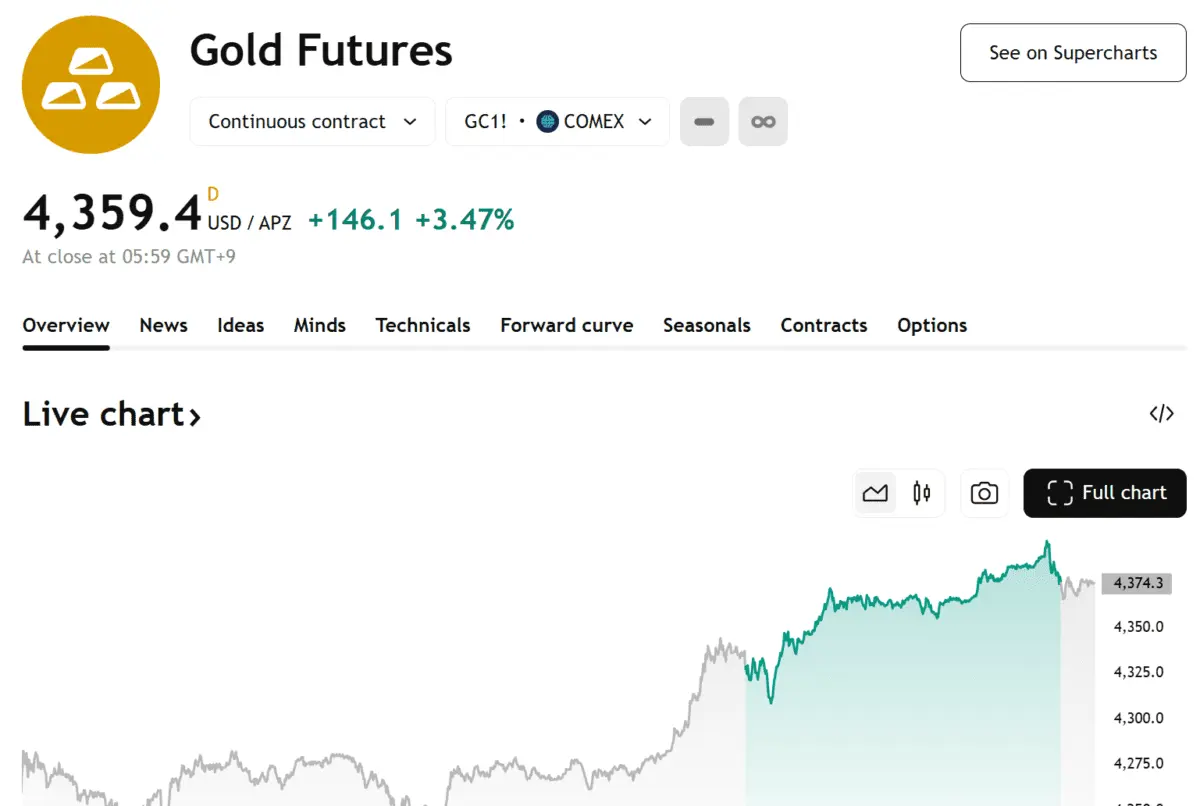 No dia 20 ( no horário local), os futuros de ouro( para entrega em dezembro) negociados na Bolsa Mercantil de Nova York( COMEX) fecharam a $4,359.4 por onça, alta de $146.1( 13.47%) em relação ao dia anterior. Durante a sessão, atingiu $4,374 em um determinado momento, estabelecendo outro recorde histórico. Este é o maior aumento diário desde abril de 2020.