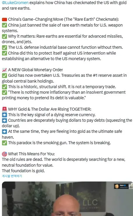 Ao restringir a exportação de elementos terras raras - materiais críticos essenciais para sistemas de armas avançados, drones e mísseis - a China está abalando a base da indústria de defesa dos EUA. Além disso, ele afirma que a China está implementando um plano estratégico para criar uma alternativa ao sistema monetário centrado nos EUA, vendendo títulos em dólares e comprando ouro.