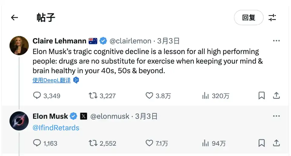 В марте 2025 года Маск ответил на пост на X, критикуя его «когнитивное снижение» и напрямую @ аккаунт. Ранее основательница Quillette Клэр Леманн написала, что Маск полагался на наркотики вместо физических упражнений, чтобы сохранить ясность ума, и Маск @IfindRetards преуменьшением, как бы намекая, что «я нашел дурака». Это взаимодействие не только привело к всплеску популярности аккаунта, но и было воспринято как молчаливое согласие Маска и признание его «культуры троллей».