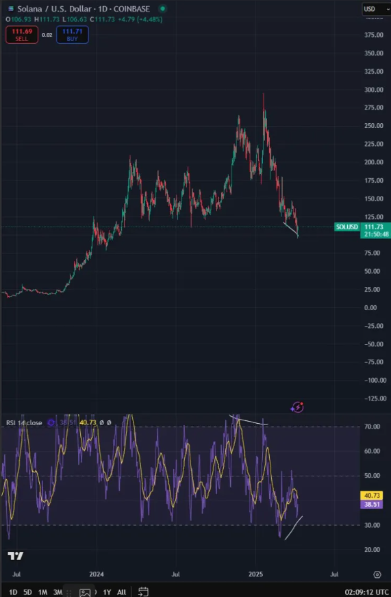 Тем не менее, в разгар штормовой распродажи все же есть несколько позитивных сигналов. Известный аналитик Bluntz заявил на Platform X, что он начал подбирать некоторые перепроданные альткоины, в том числе Solana, когда на RSI появляются сигналы бычьей дивергенции. По его словам, многие токены упали почти вертикально — модель, которая часто сигнализирует о сильной краткосрочной устойчивости.