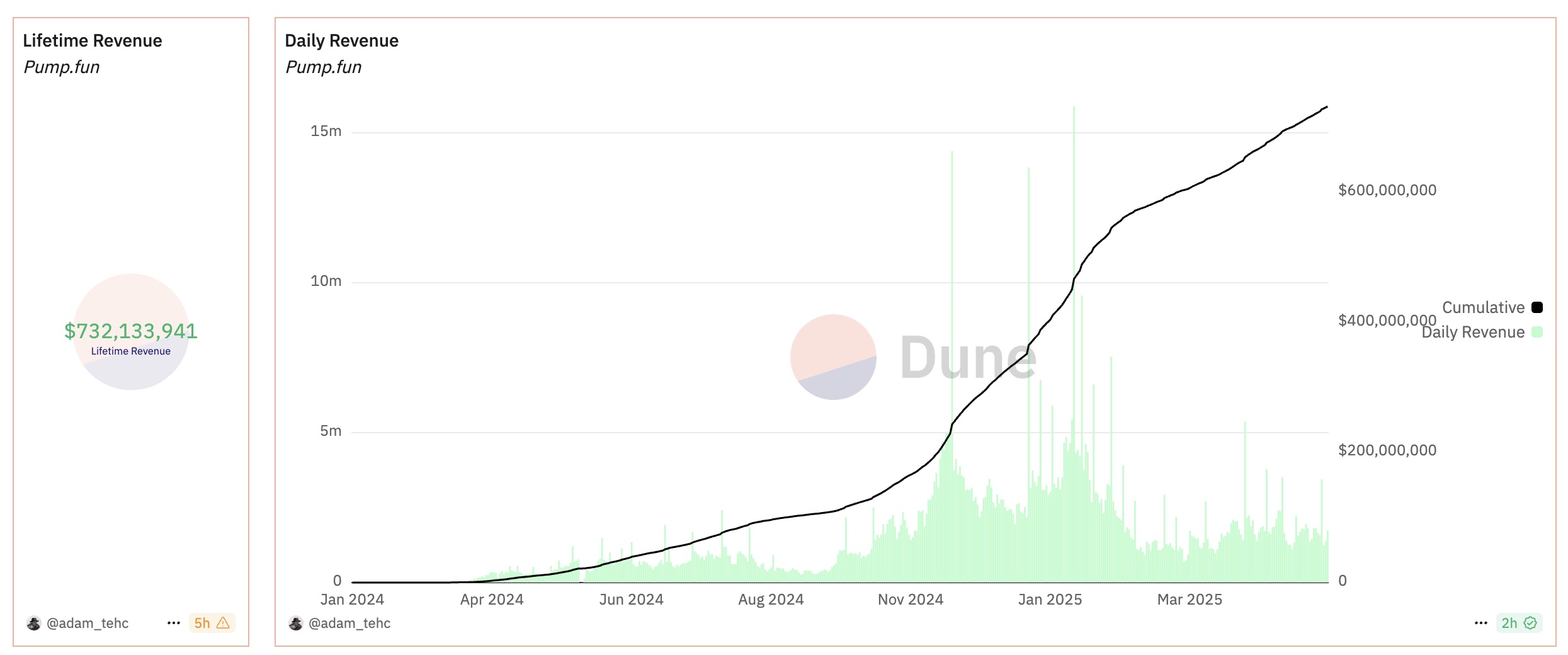 С момента запуска в январе 2024 года Pump.fun заработал более 732 миллионов USD от сборов. Несмотря на растущую конкуренцию в области запуска токенов, эта платформа продолжает постоянно расширять свою экосистему продуктов.