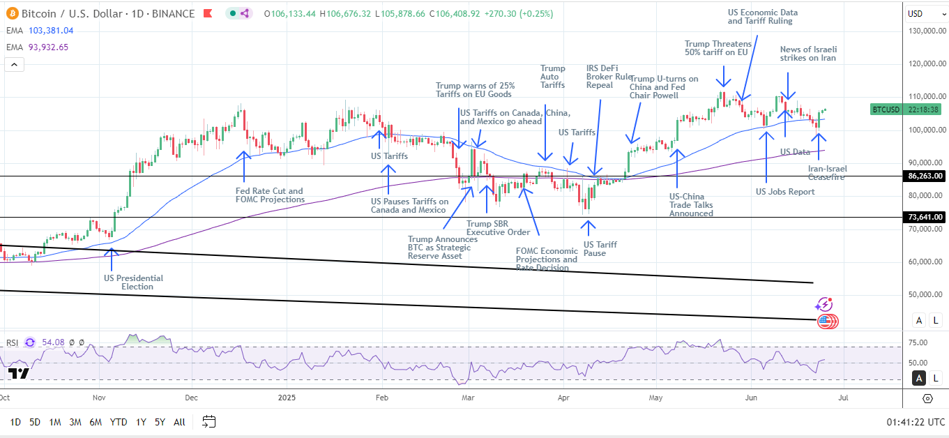 Сценарий падения: Снова напряженная ситуация на Ближнем Востоке, препятствия в законодательстве, угрозы таможенных пошлин со стороны США и отток средств из ETF. Эти факторы в совокупности могут привести к снижению BTC к 50-дневной экспоненциальной скользящей средней (EMA) и возможному пробою отметки в 100 тысяч долларов.