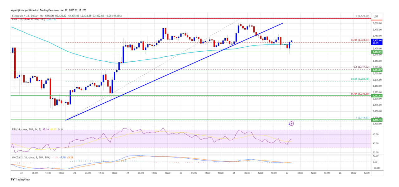 Цена Ethereum в настоящее время торгуется выше 2400 долларов и 100-часовой простой скользящей средней. В сторону роста цена может столкнуться с сопротивлением около 2500 долларов. Следующий ключевой уровень сопротивления находится около 2520 долларов.