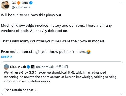 Недавнее взаимодействие этих двух технологических гигантов произошло на платформе Илонa Маска X. 21 июня 2025 года, бывший китайский миллиардер Чжао Чанпэн (CZ) на своем аккаунте X прокомментировал, как он планирует использовать предстоящую итерацию обновления Grok 3.5.