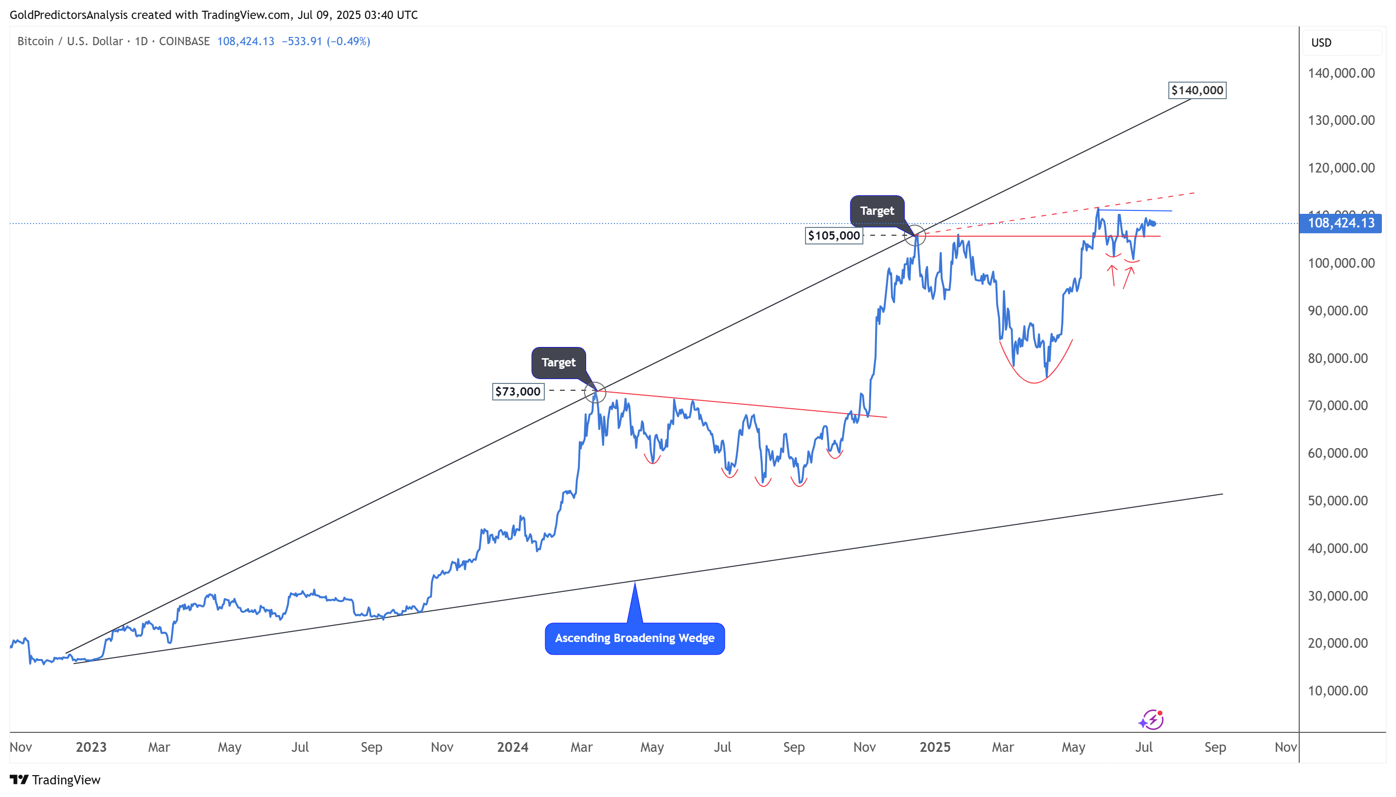 Пробитие этой красной пунктирной трендовой линии может вызвать сильное движение. В этом случае следующая цель — уровень 140 000 долларов, что обозначает первый важный рубеж этой бычьей формации. Кроме того, появление восходящего расширяющегося клина указывает на усиление волатильности и поддерживает возможность значительного прорыва.