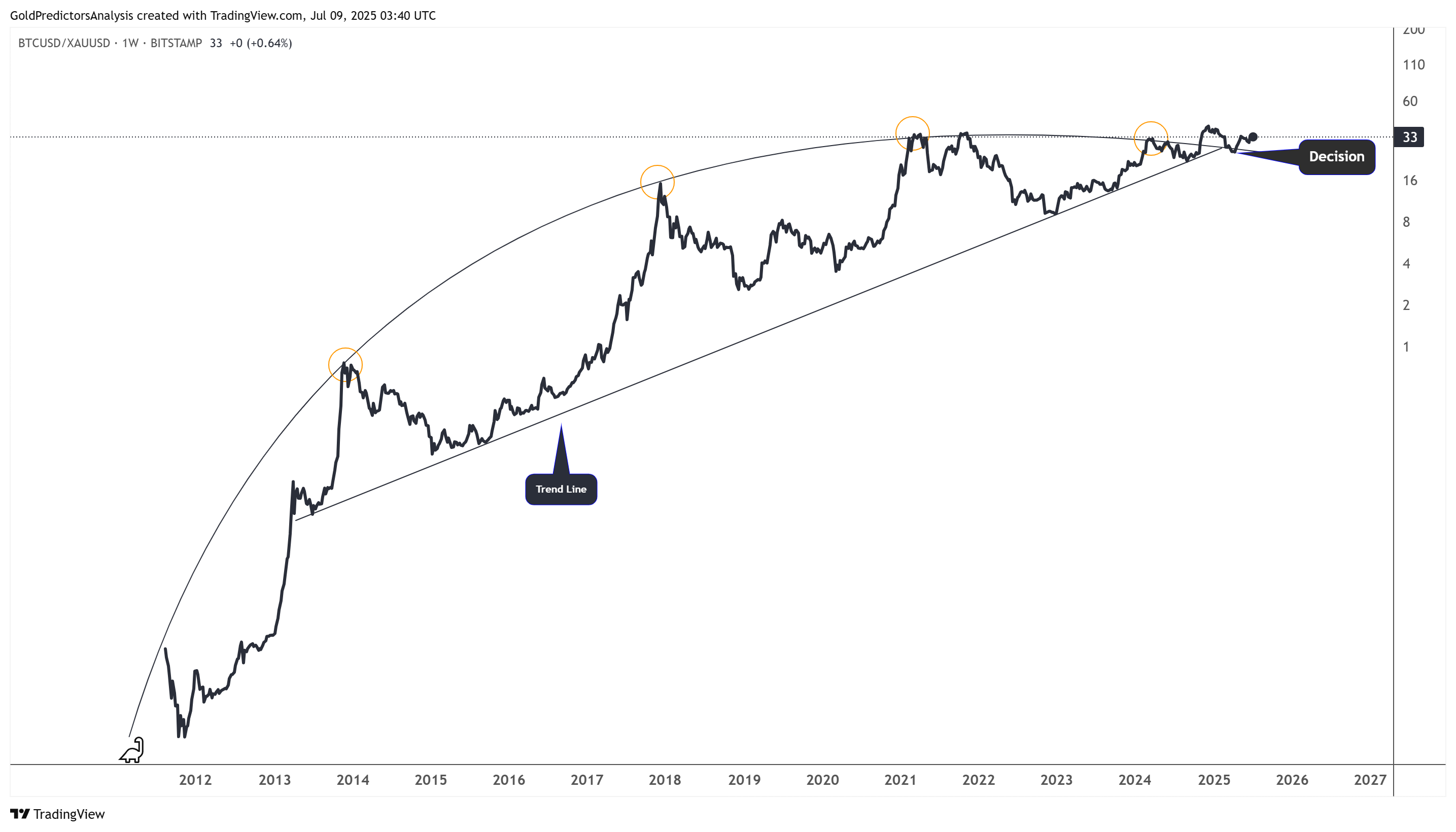 Ниже приведенный недельный график дополнительно подчеркивает бычий ценовой тренд Биткойна по отношению к золотому соотношению, на графике видно, что это соотношение в настоящее время пытается突破该弧线. Этот шаг может привести к восходящему тренду этого соотношения. Прорыв уровня 42 может вызвать сильное восходящее движение.