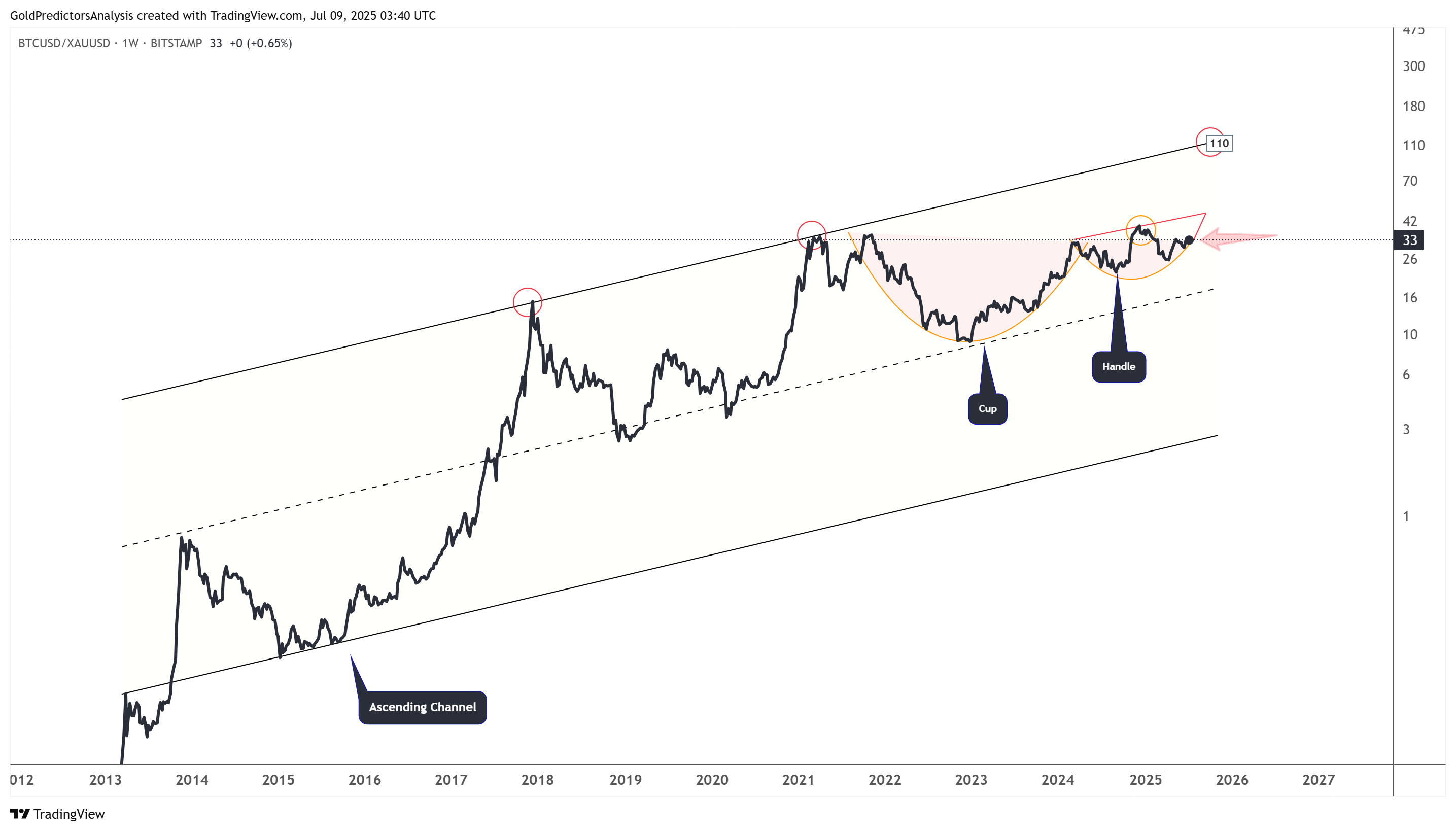 Аналитик FXEmpire Мухаммад Умайр заявил, что соотношение Биткойн к золоту показывает, что оно формирует модель “чашка с ручкой”, и в настоящее время цена находится на границе этой модели. Прорыв уровня 42 может вызвать сильный рост этого соотношения до 110. Этот восходящий прорыв может поднять цену Биткойна выше 115000 долларов и, возможно, вызвать сильный рост до области 140000 долларов.