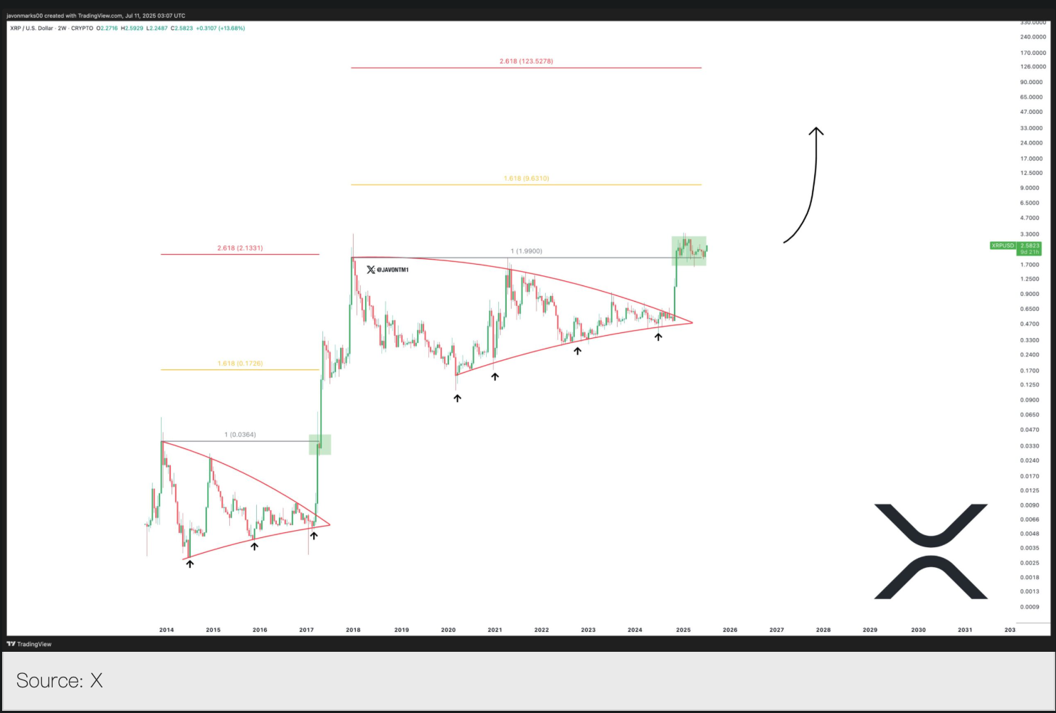 Ключевые уровни сопротивления и цели: Технические эксперты указывают, что если цена XRP сможет эффективно преодолеть уровень сопротивления в $2.56, то $3 станет следующим важным целевым значением. Известный криптоаналитик Javon Marks пошел дальше, заявив, что XRP, возможно, движется к историческому максимуму в $9.631, что означает, что с текущих уровней существует потенциал роста на 251%.