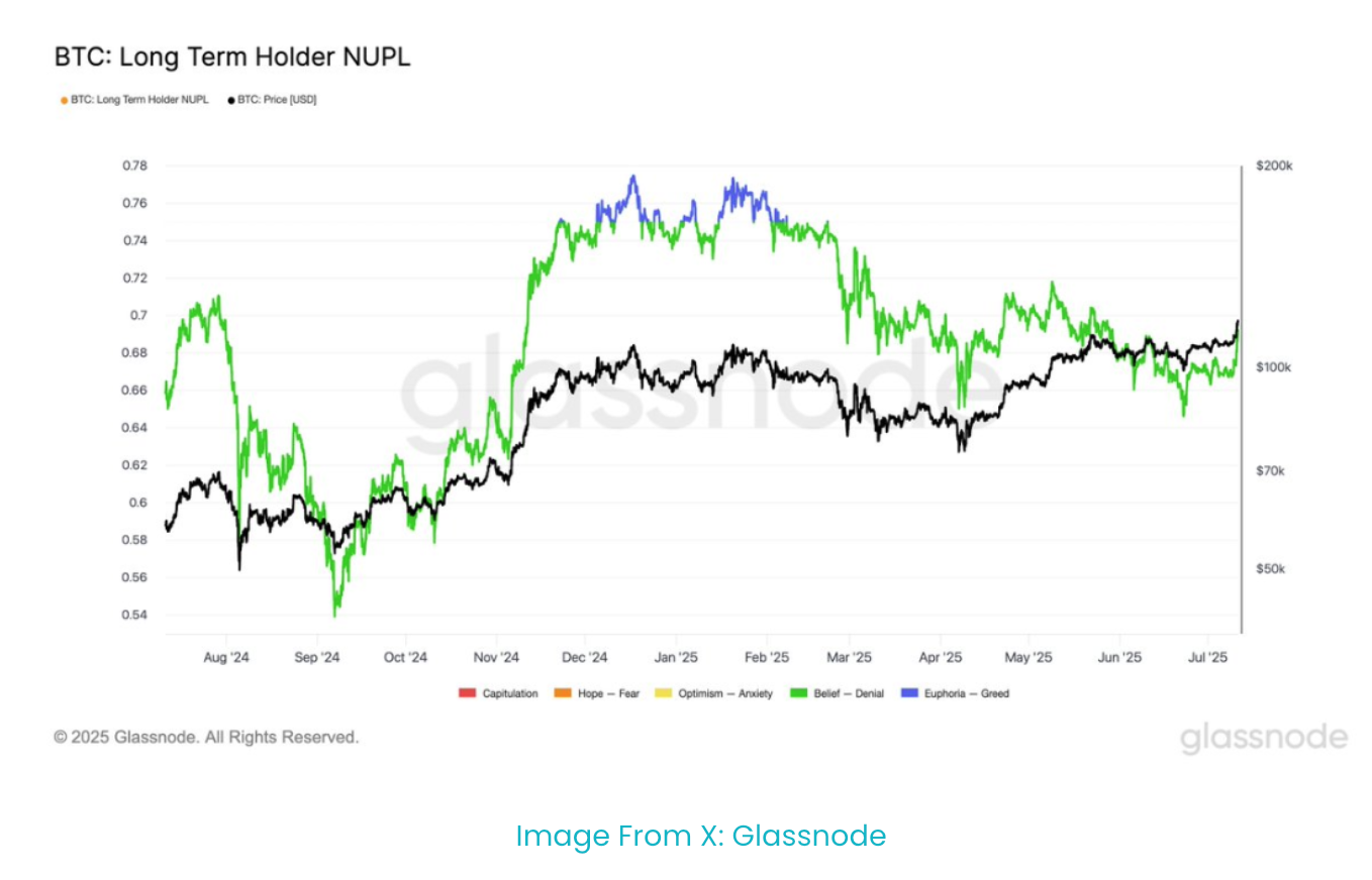 Согласно индикатору чистой нереализованной прибыли и убытков (NUPL) от Glassnode, текущий уровень прибыли долгосрочных держателей Биткойна составляет 0.69. Несмотря на то что Биткойн только что установил исторический максимум, это значение значительно ниже порогового значения “рыночного безумия” в 0.75.