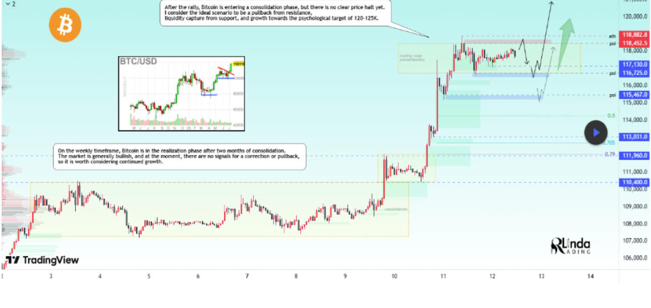 С другой стороны, Биткойн все еще может прорваться выше 118,000 долларов и дальше подняться до 125,000 долларов, но для этого нужно выполнить определенные условия. Ключевое условие для продолжения роста заключается в том, что Биткойн должен дневной график закрыться выше 118,400 долларов и 118,900 долларов. По словам RLinda, закрытие дневного графика выше этих уровней будет означать “структурный прорыв”. Это, в свою очередь, подтвердит, что рынок переходит от консолидации к новой фазе роста.