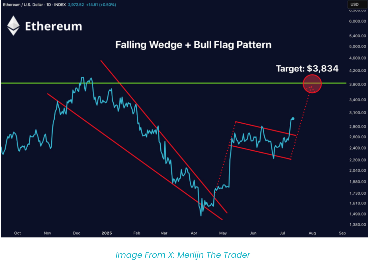Согласно графику анализа Мерлиджа, нисходящий клин, приведший к развороту, начинается с максимума декабря 2024 года и продолжается до минимума апреля 2025 года, прорыв происходит в середине мая. После прорыва Эфир вошёл в компактный флаговый диапазон, который продолжался до июня, пока недавно не преодолел $2,700.