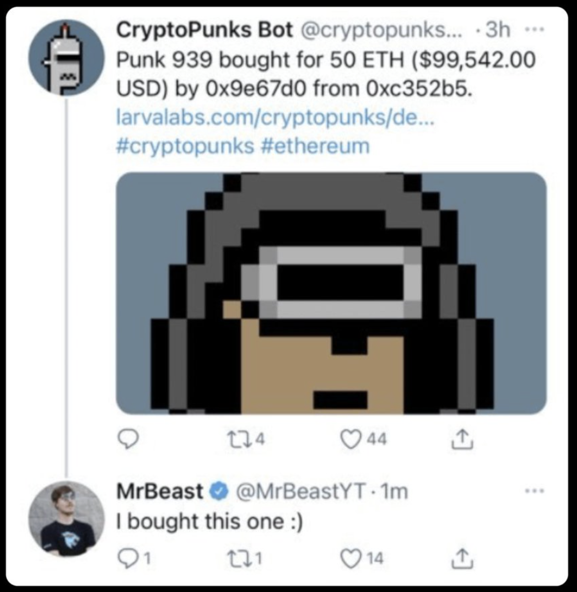 В феврале 2021 года MrBeast громко объявил о покупке восьми NFT CryptoPunks, в сочетании с предыдущими покупками, он приобрел в общей сложности более десяти NFT CryptoPunks. В дополнение к этому, на рынке в то время было много знаменитостей из мира развлечений, что привело к резкому росту минимальной цены на CryptoPunks. К августу MrBeast начал продавать часть своих NFT, самый дорогой из которых, CryptoPunk #7200, был продан за 120 ETH, что по тогдашнему курсу составило примерно 389500 долларов США. По сравнению с первоначальной стоимостью в 2166 долларов, этот NFT принес ему более 380000 долларов прибыли, увеличившись более чем в 178 раз.