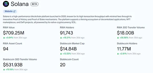 Согласно данным, экосистема RWA в Solana, хотя и находится на ранней стадии, уже демонстрирует сильный рост. По данным RWA.xyz, в настоящее время в экосистеме Solana насчитывается 94 вида активов RWA, а общая рыночная капитализация составляет 700 миллионов долларов. За последние 30 дней объем переводов RWA в сети Sol достиг 18 миллиардов долларов, а объем торгов только уступает эфиру.