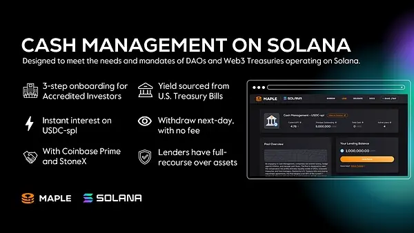 В мае 2023 года Maple запустила инвестиционное решение Maple Cash Management Pool, предлагая пользователям чистую APY около 4,8%** на основе доходности гособлигаций, с возможностью свободного входа и выхода из пула без уплаты замороженных или выкупных сборов, став первой в экосистеме Solana гособлигацией RWA. **На данный момент продукт был расширен до кредитования USDC, но учитывая его новаторскую роль в экосистеме Solana, он также упоминается в данной статье.